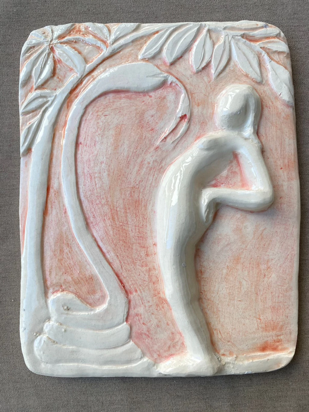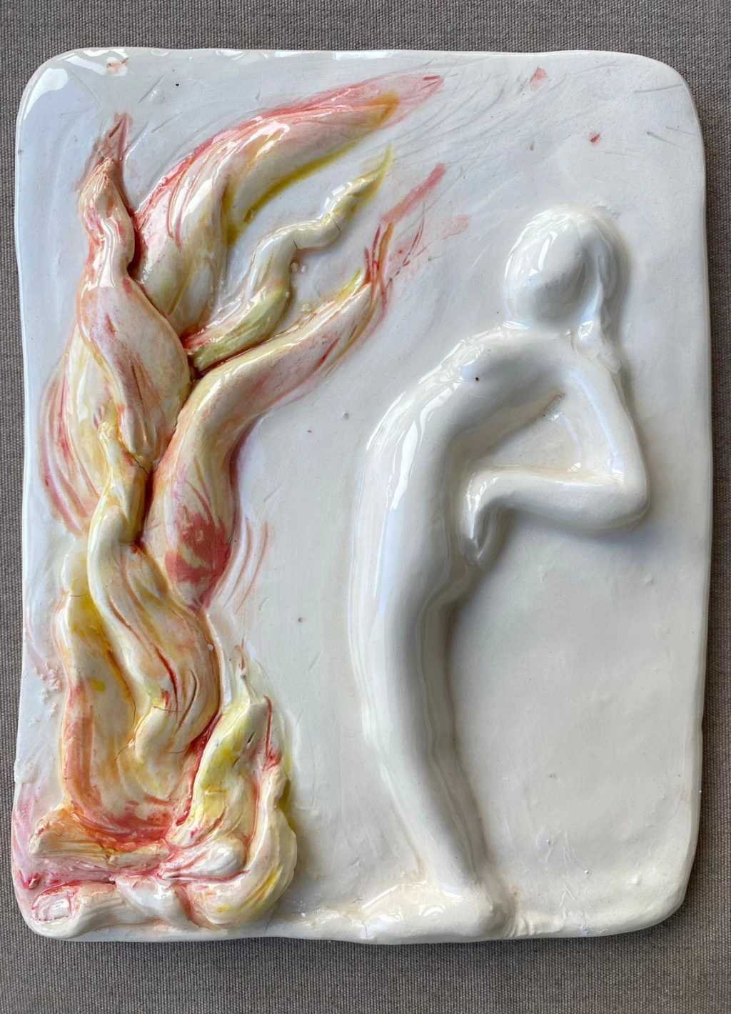 En el oráculo corporal, la artista Maica González, crea relieves de cerámica que buscan dar forma a emociones invisibles. A través de gestos y posturas, construye narrativas visuales en las que lo físico, lo emocional y lo espiritual se entrelazan, proponiendo al cuerpo como un oráculo visual y como un puente hacia lo intangible.
